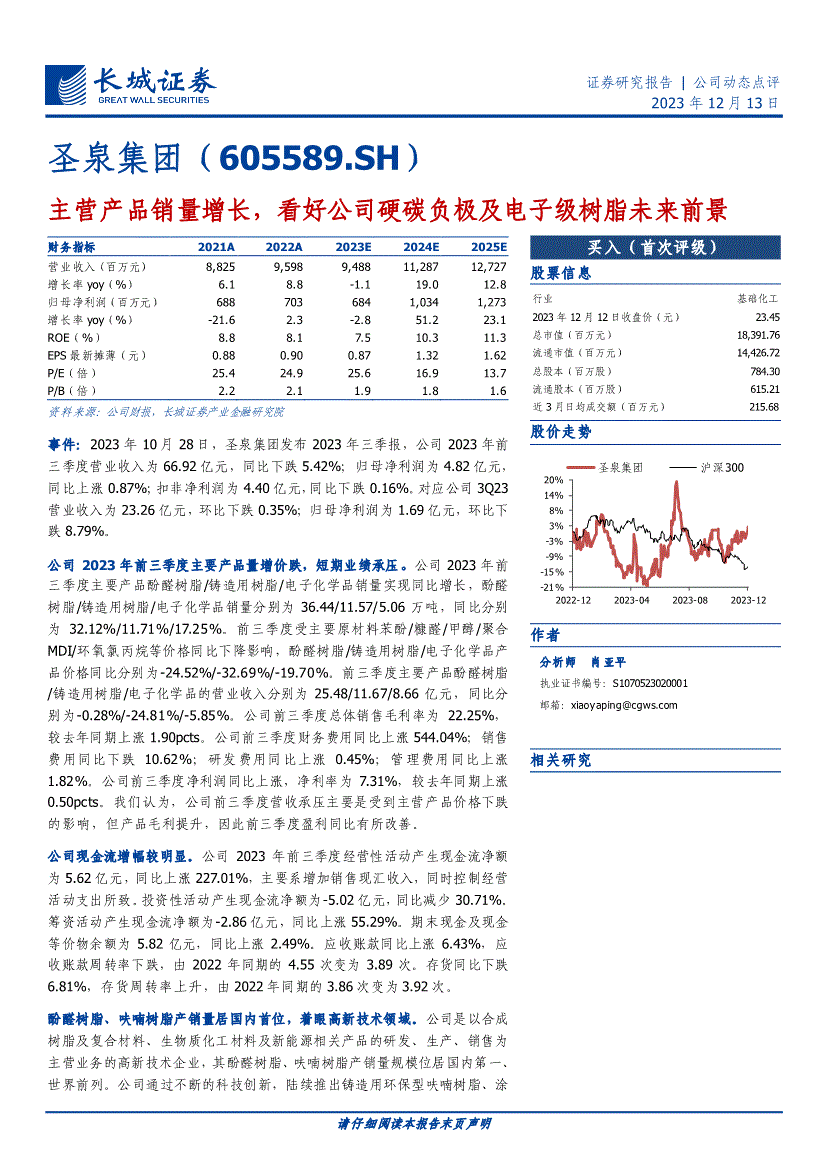 公司通过不断的科技创新◈★★★,陆续推出铸造用环保型呋喃树脂◈★★★、涂买入(首次评级) 股票信息 行业基础化工2023年12月12日收盘价(元) 23.45 总市值(百万元) 18,391.76 流通市值(百万元) 14,426.72 总股本(百万股) 784.30 流通股本(百万股) 615.21 近3月日均成交额(百万元) 215.68 股价走势作者 分析师 肖亚平执业证书编号◈★★★:S01 邮箱◈★★★: 相关研究-21% -15% -9% -3% 3% 8% 14% 20% -04-12圣泉集团沪深300公司动态点评P.2料◈★★★、保温冒口等铸造辅助材料◈★★★,各类环保型◈★★★、耐热及增韧改性高性能酚醛树脂◈★★★、印制电路板及光刻胶用电子级酚醛树脂◈★★★、电子级环氧树脂以及航空航天用高强度酚醛预浸料◈★★★、高强低密度酚醛SMC◈★★★、阻燃增强轻质酚醛轻芯钢◈★★★、改性阻燃酚醛泡沫等产品◈★★★,下游应用领域逐步拓展到汽车◈★★★、风电◈★★★、核电等机械制造领域◈★★★,以及集成电路◈★★★、液晶显示器◈★★★、航天航空◈★★★、建筑节能◈★★★、高端刹车片◈★★★、冶金耐火◈★★★、3D打印等国民经济各个领域◈★★★。